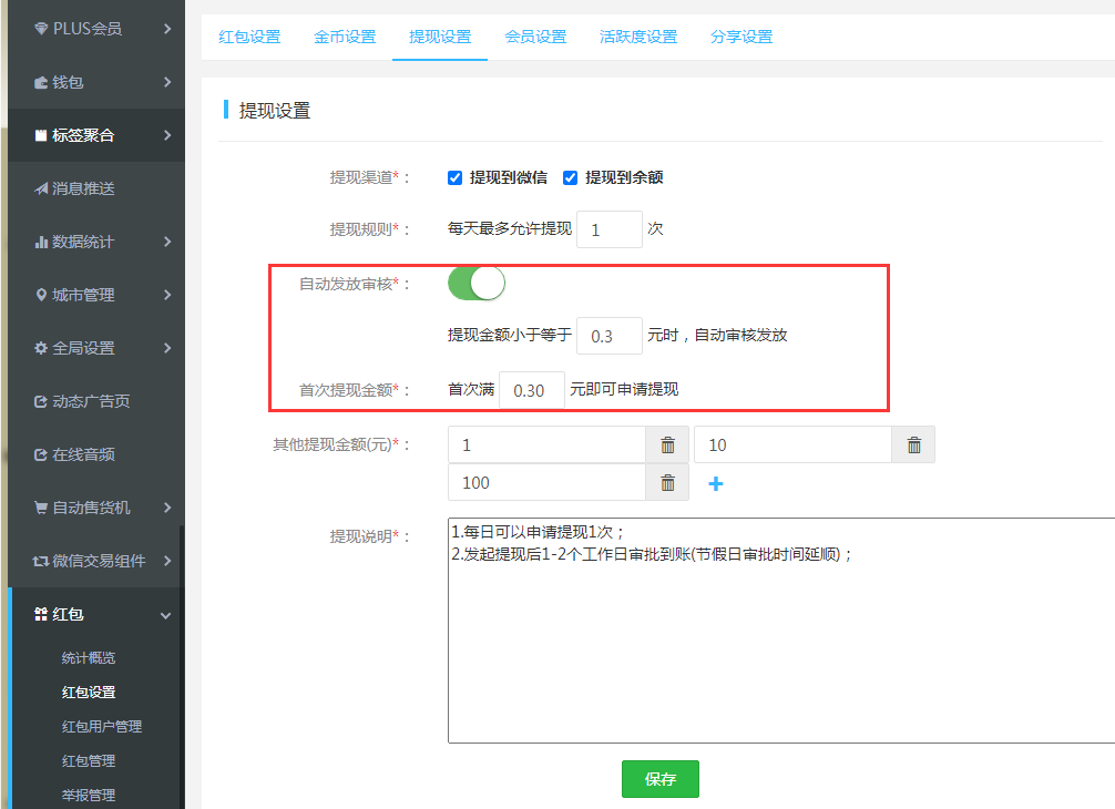 注:自動發放審核、首次提現 金額不得低于0.3元,低于0.3元微信無法自動付款