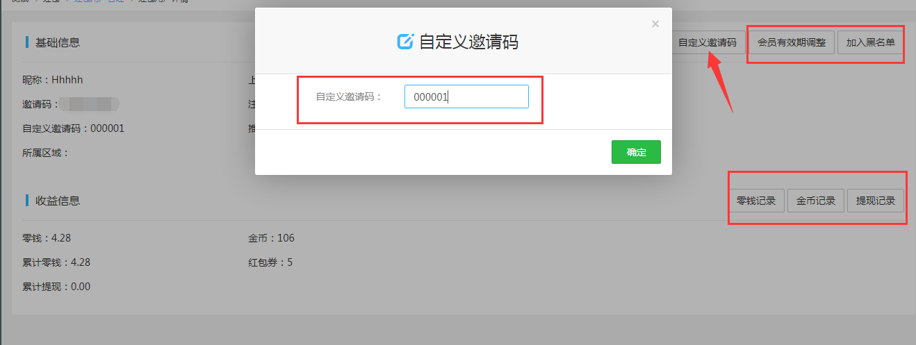 3.紅包用戶管理:已注冊用包的用戶可在當前點擊名稱查看詳情信息,并修改自定義邀請碼(邀請碼需要在4-8位字母/數字或組合)
