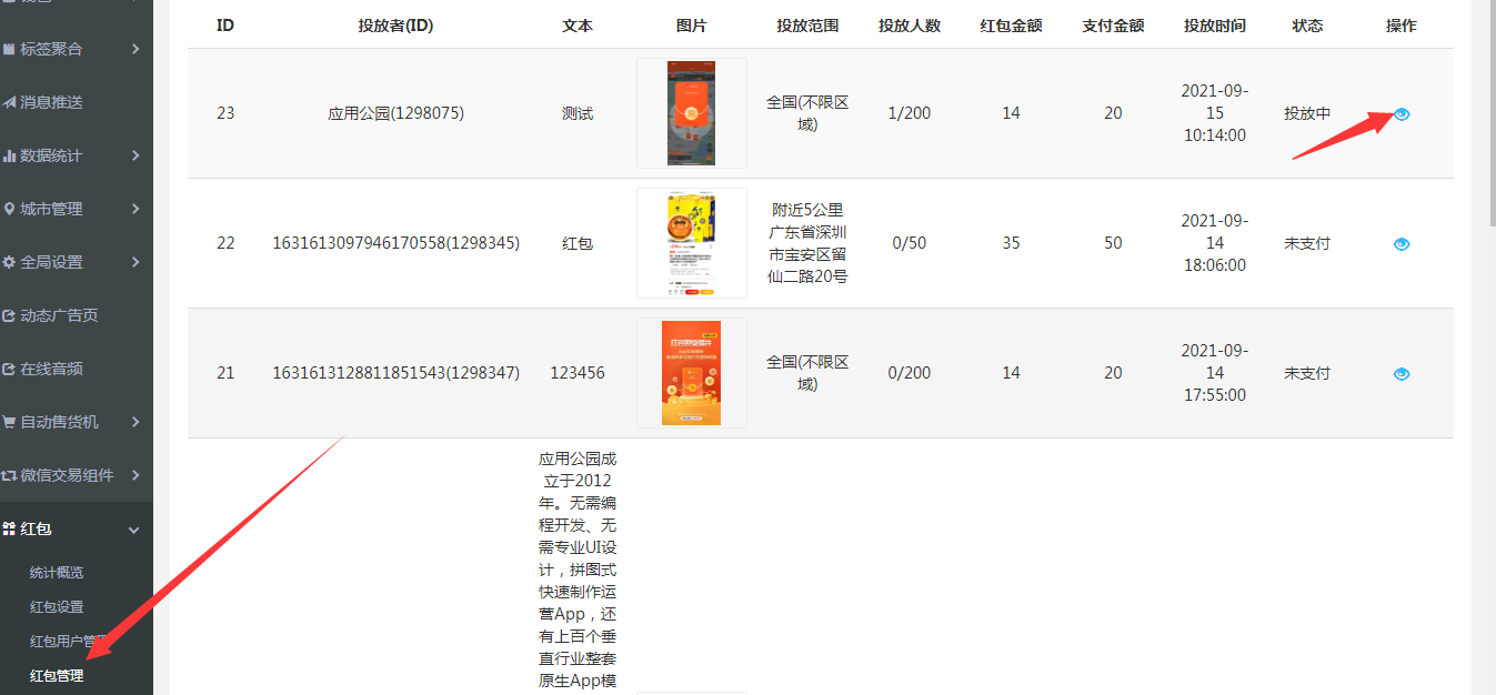 4.紅包管理:用戶發布的紅包內容,如里有違規或不符合要求的針對進行下架以及駁回編輯 。