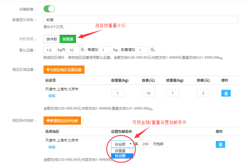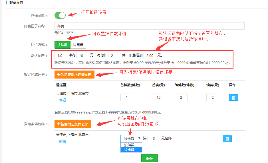 5.郵費設置(自營店鋪統一設置、第三方店鋪單獨設置),郵費分兩種計價方式(按件數/按重量),支持設置指定地區運費以及包郵。