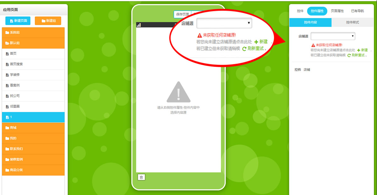 2.以上設置好后,點擊“控件屬性”——“控件內容”,選擇店鋪源,如果尚未建立店鋪,點擊“+新建”/右上角的“運營管理”,跳轉到“運營管理平臺”添加。