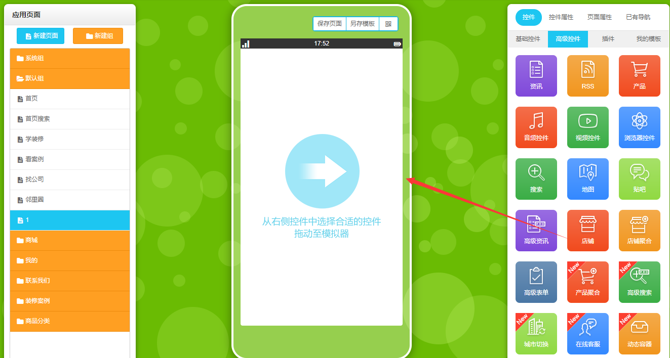 1.新建頁面,并在“高級控件”中選擇“店鋪”控件,將其拖入模擬器中,該控件默認全屏顯示,不支持再添加其他控件,(頁面自帶返回鍵,無需設置返回鍵)