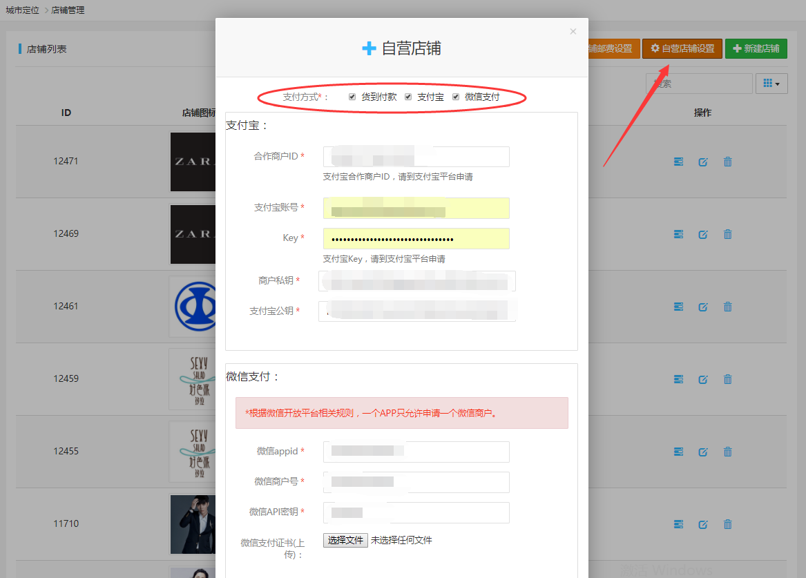 6.支付設置(自營店鋪設置、第三方單個店鋪設置)