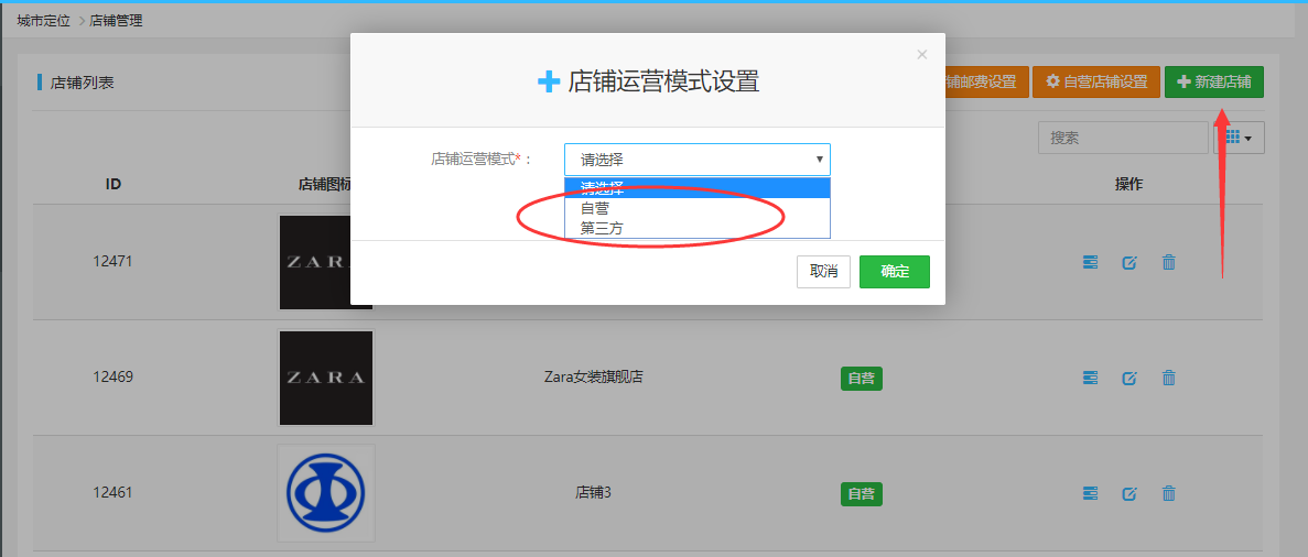 *若建立的店鋪是自己經營,店鋪運營模式可選擇為“自營”;商家入駐店鋪, 運營模式選擇為“第三方”;以便管理。店鋪運營模式建立之后不能再修改,選擇需謹慎,店鋪建立好之后,需要完善店鋪設置信息,
