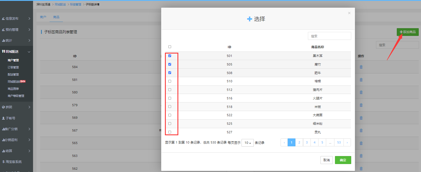 外賣分類聚合獲取的是外賣標簽。同城配送商戶管理里面的標簽管理添加好標簽和子標簽以后,選擇添加已有的產品即可。