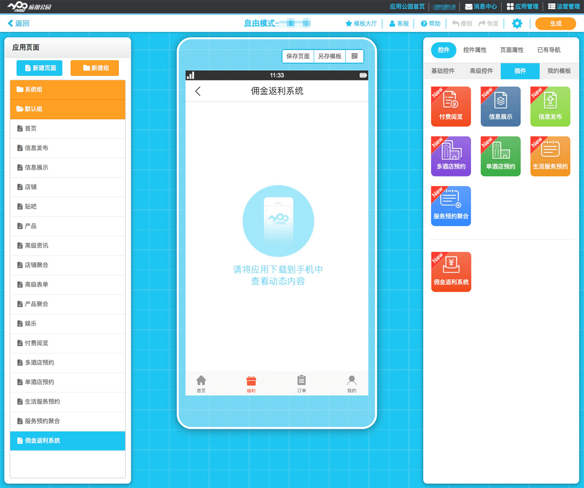 2、在手機App中添加傭金返利系統:通過應用公園平臺,新建頁面,然后直接以功能插件的形式植入在App中。
