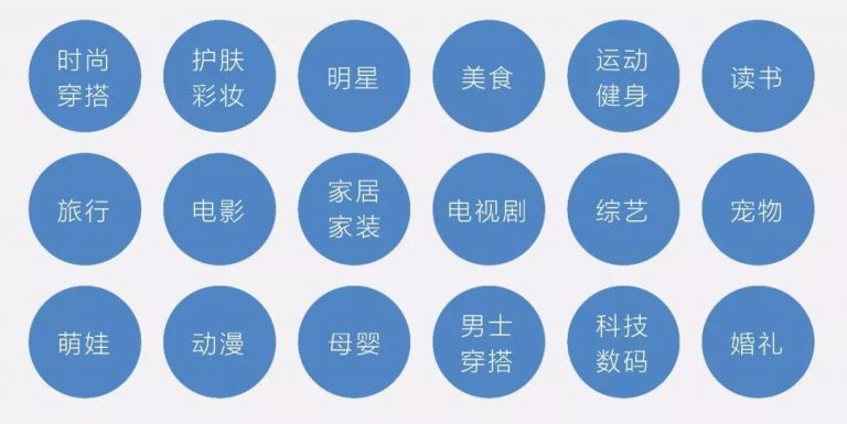 小紅書根據內容定位延伸出來的主要內容話題分為時尚穿搭、護膚彩妝、明星、美食、運動健身、讀書、旅行、電影、家居家裝、電視劇、綜藝、寵物、萌娃、動漫、母嬰、男士穿搭、數碼科技、婚禮這18個方向。