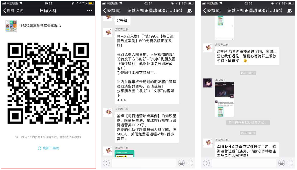 主要基于微信群,用戶掃碼加入臨時群,機器人提醒轉(zhuǎn)發(fā)話術(shù)及二維碼到朋友圈,截圖發(fā)送到群后,超過時間沒有轉(zhuǎn)發(fā)的自動踢出群。因為有小號做示范引導(dǎo),羊群效應(yīng)下,很容易誘導(dǎo)用戶進行轉(zhuǎn)發(fā)分享。