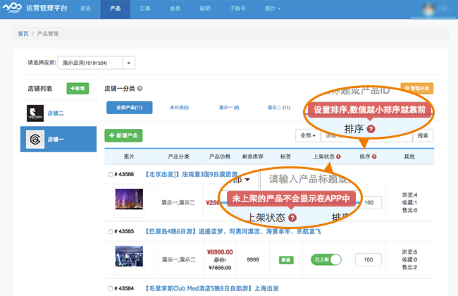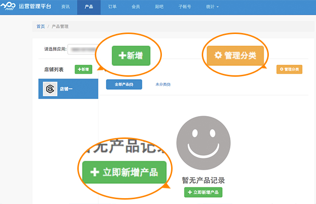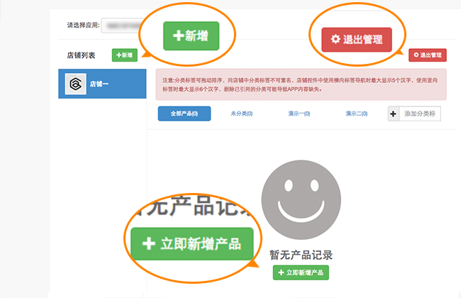 5.建立好店鋪后,可以開(kāi)始建立店鋪分類了。我建立了2個(gè)店鋪組,這里挑選“店鋪一”為大家做演示。我在這個(gè)店鋪中建立了2個(gè)分類,分別為“演示一”、“演示二”。您只需點(diǎn)擊頁(yè)面右上方的的“管理分類”按鈕,然后開(kāi)始編輯即可。如果想要?jiǎng)h除您建立的分類,也是同樣的方法,在“管理分類”變?yōu)椤巴顺龉芾怼焙螅c(diǎn)擊分類名稱,就會(huì)出現(xiàn)刪除按鈕。(在點(diǎn)擊了“管理分類”后,分類的排序可以拖動(dòng)。)這些都建好后,就點(diǎn)擊“立即新增產(chǎn)品”,開(kāi)始添加產(chǎn)品了。
