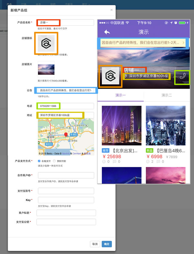 *店鋪組名稱、店鋪圖標(biāo)、店鋪圖片、公告、電話及地址僅在VIP的店鋪控件中顯示,產(chǎn)品控件不顯示這些內(nèi)容,如果不適用店鋪控件,可以不添加出店鋪組名稱外的這些內(nèi)容。