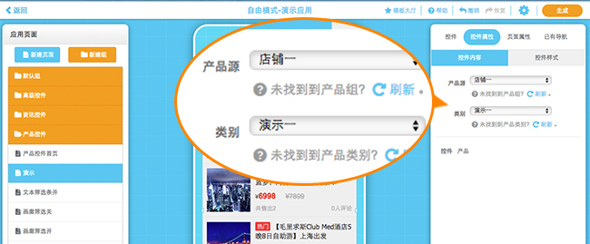 1.新建頁(yè)面,并在“控件”中選擇“產(chǎn)品”控件,將其拖入模擬器中,設(shè)置好大小。在“控件屬性”——“控件樣式”中,如果想全屏顯示,控件的寬度應(yīng)設(shè)置為320,高度設(shè)置為“高度自適應(yīng)”。(為了有良好的展示效果,一般建議一個(gè)產(chǎn)品控件占據(jù)一個(gè)頁(yè)面,不再添加其他控件,列表,宮格類控件使用方法與其類似。)