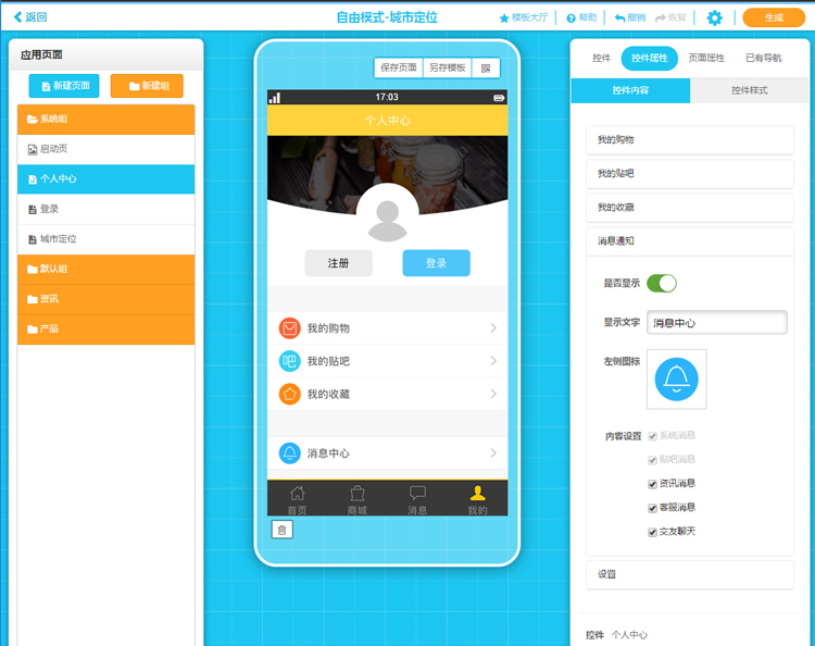 11.支持直接從個人中心頁面消息中心進入,亦可通過按鈕、圖片等控件直接連接“消息通知”。