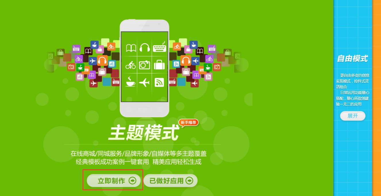 第二步:選擇商城APP開發(fā)模式,,這里選擇主題模式,可以借助應(yīng)用公園的平臺已經(jīng)做好的商城APP模板,可以一鍵套用,僅需對圖片文字進行修改即可。