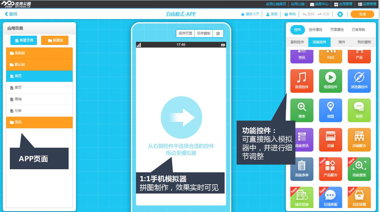 自由模式:平臺擁有上百種APP功能控件,比如在線聊天、地圖定位、在線支付、登陸注冊、積分簽到等等。這些功能任你挑選,自由組合靈活搭配。從零搭配你的APP。